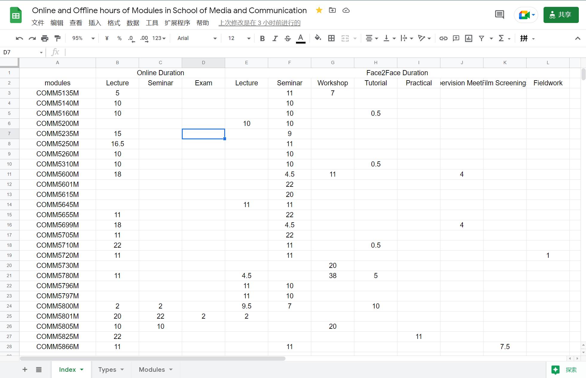 This dataset is divided into two categories: course types and module types. Lectures, seminars, workshops, and other types of courses are available. Teaching approaches are intimately linked to different course kinds. Only 12% of seminars are held online, but 80% of courses are held online. Furthermore, the lectures account for almost 87 per cent of online hours (243.5 hours). The rationale for this is simple: the more students in a classroom, the more likely COVID-19 regulation will have an impact.