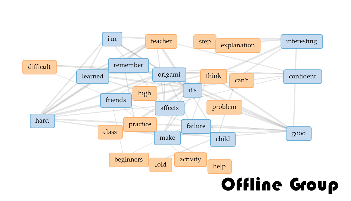 We took into account all of the participants' feedback on the activity throughout the interviews. The practice was said to be fascinating but difficult to recall by participants in an online group. It was tough to monitor their own procedure and ask queries because they had to switch their focus between the screen and their hands. Some participants also stated that they did not pay full attention during the teaching session because they expected a replay after the teaching lesson so they could review the procedure again, which caused them to recall the process more slowly during the exam. Participants in the in-person activity indicated that mastering the paper folding crafts was difficult for them, but that with the help of other participants and the teacher, they were able to overcome the challenges. It was also a fun way to meet new people while participating in the activity. A test taker who scored the highest claimed that she was confident in the paper folding craft and had helped many other people. She also stated that she had refreshed her own memory of the crafts multiple times, which was the main reason she succeeded.