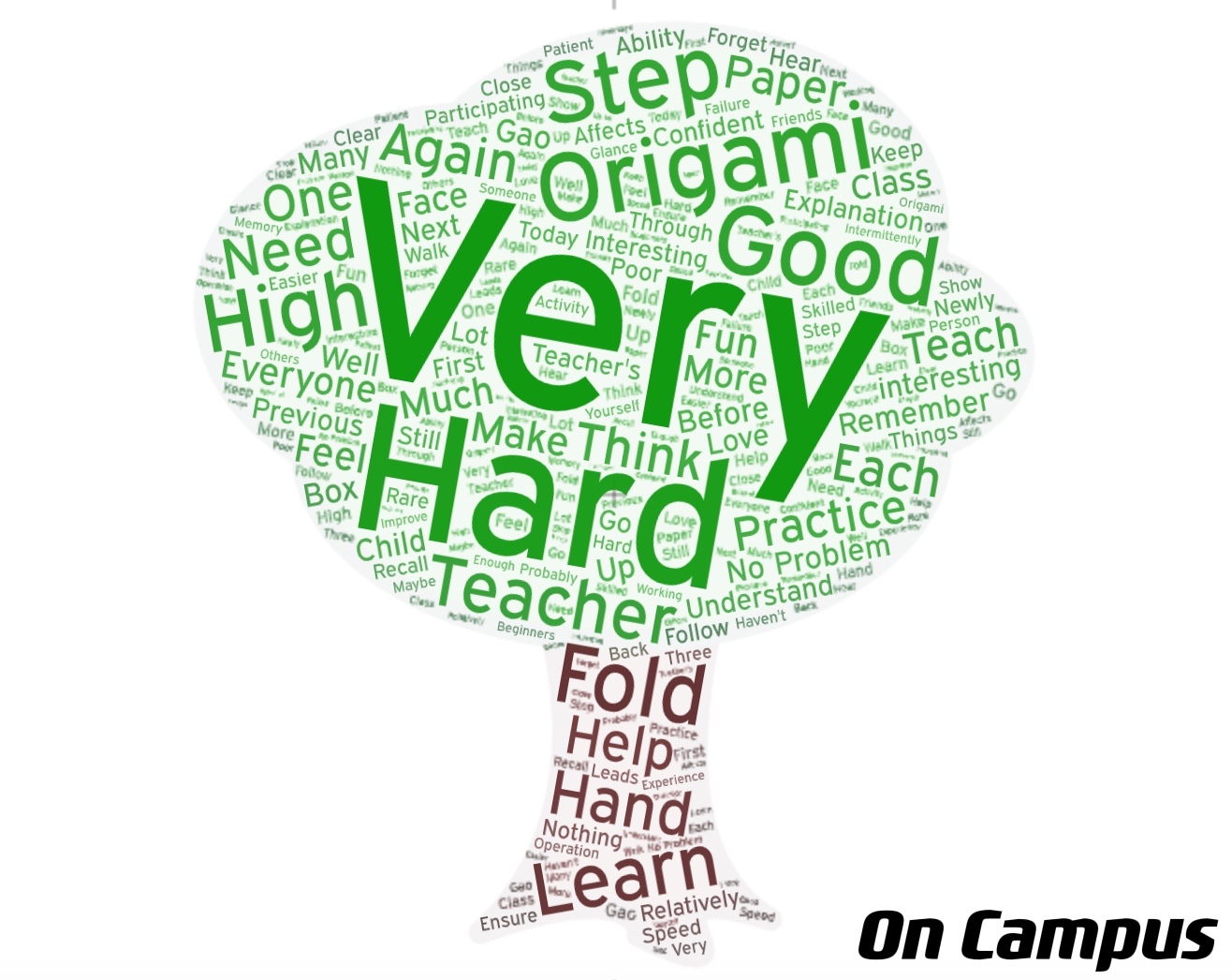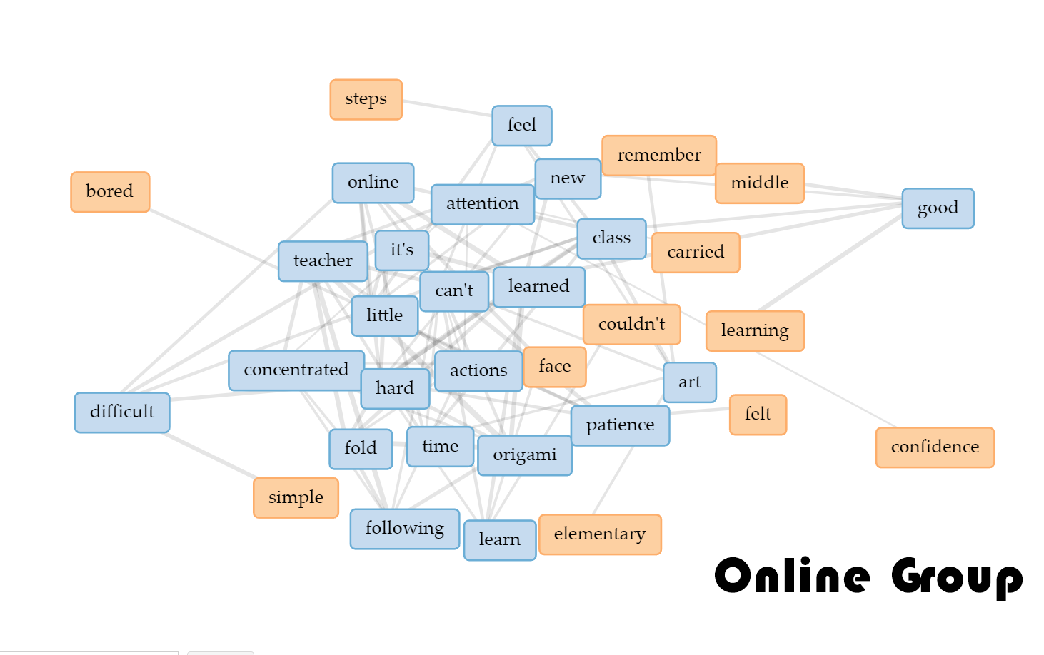 The study consisted of 12 participants(6 male and 6 female), and further divided them into two groups. The instructor taught them how to make paper folding crafts at 5 different levels, and the sessions were delivered in two methods. One group attended the online session, and the other group attended the on-campus session. After the teaching session we invited participants to complete a 10 minutes test to make 5 crafts that they learned, and we recorded the data and presented it in the dot plot graph.